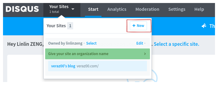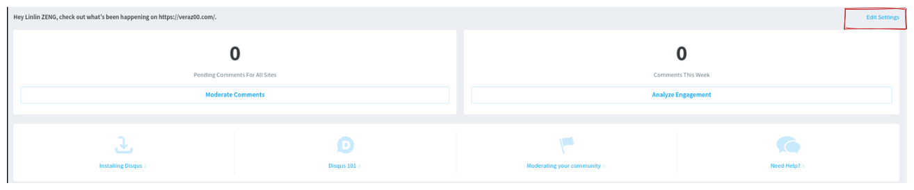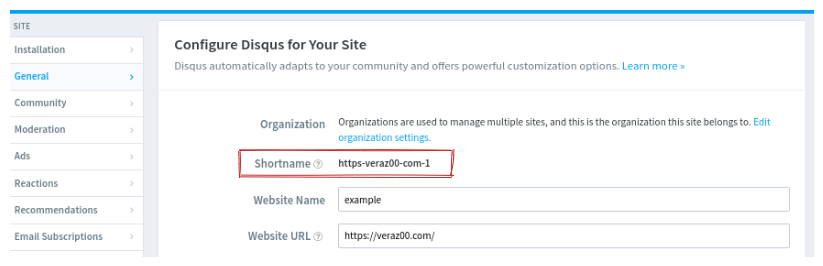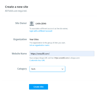 - Create a site on Disqus and enter the Website Name as the blog link.
