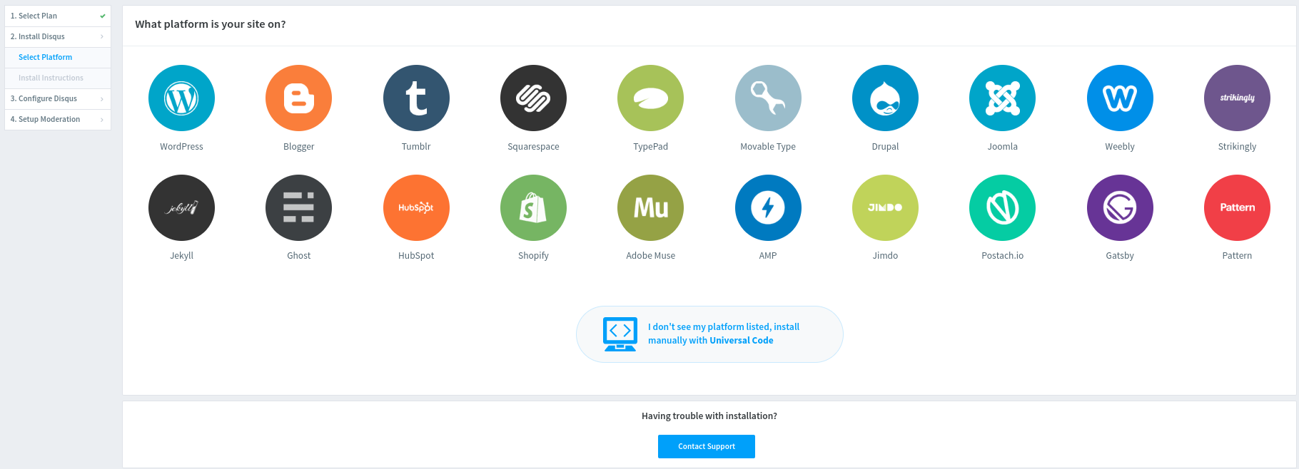 - On the Select Platform step of the Install Disqus section, you can skip it if your platform is not listed.