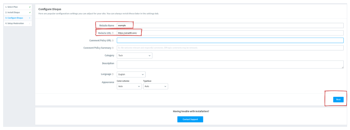 - On 3. Configure Disqus, fill in Website Name and Website URL, then Click Next.