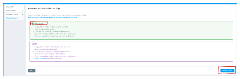 - Coming to 4. Setup Moderation, Choose Balances, which allows all types of comments from guests or GitHub users.