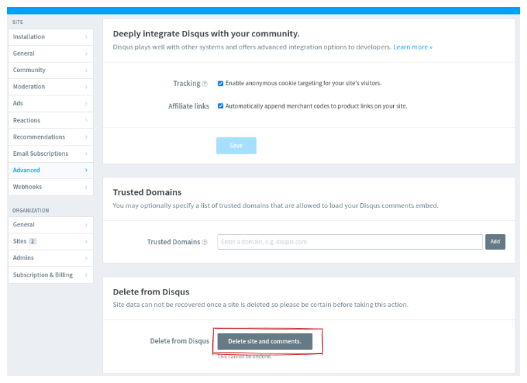 - To remove the site from Disqus, go to Your Sites > Edit on the upper-left side, then navigate to the Advanced page. Near the bottom, click the ‘Delete site and comments’ button. That can delete the site registeration on Disque.