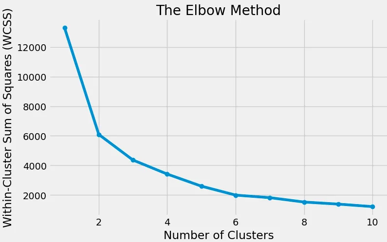 # features = stock_data[['annual_return', 'annual_volatility', 'vwdr']] features = stock_data[['annual_returns', 'annual_volatility', ]] wcss = [] for i in range(1, 11): kmeans = KMeans(n_clusters=i) kmeans.fit(features) wcss.append(kmeans.inertia_) # Plotting the Elbow Method graph plt.figure(figsize=(8,5)) plt.plot(range(1, 11), wcss, marker='o') plt.xlabel('Number of Clusters') plt.ylabel('Within-Cluster Sum of Squares (WCSS)') plt.title('The Elbow Method') plt.show()